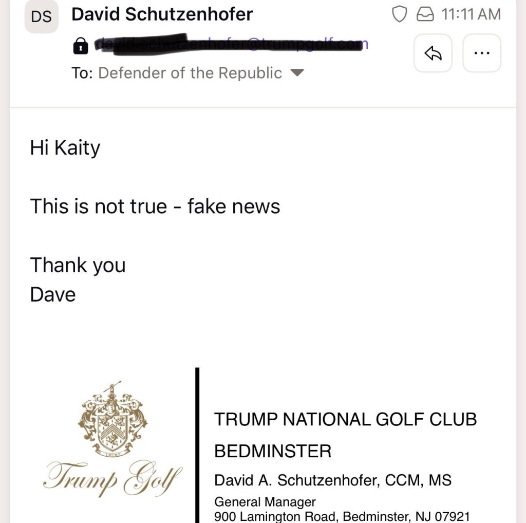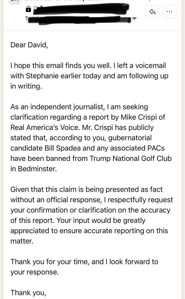 On May 8th, 2025, an independent investigative journalist known as Defender of the Republic on X and Instagram published an email from Trump National in Bedminster General Manager David Schutzenhofer. The email was plain as day, undeniable, and directly from the venue that Crispi swore was closed to Spadea “for life.”