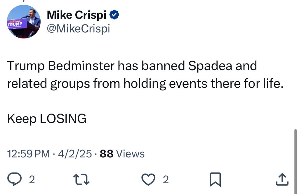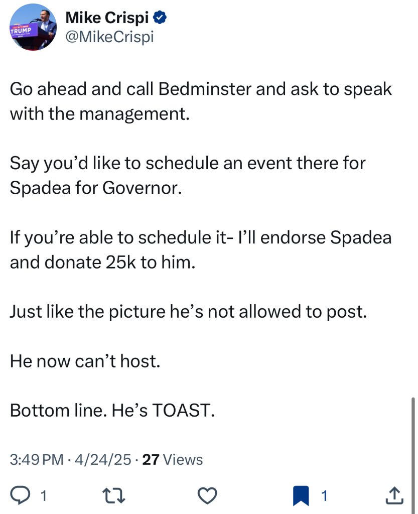 There’s a fine line between bold commentary and flat-out dishonesty. Mike Crispi, a self-styled conservative commentator, crossed that line when he made a loud, unequivocal claim on social media: that Trump National Golf Club in Bedminster had banned gubernatorial candidate Bill Spadea and any related groups from ever hosting events on the premises. “He now can’t host. Bottom line. He’s TOAST,” Crispi posted confidently.